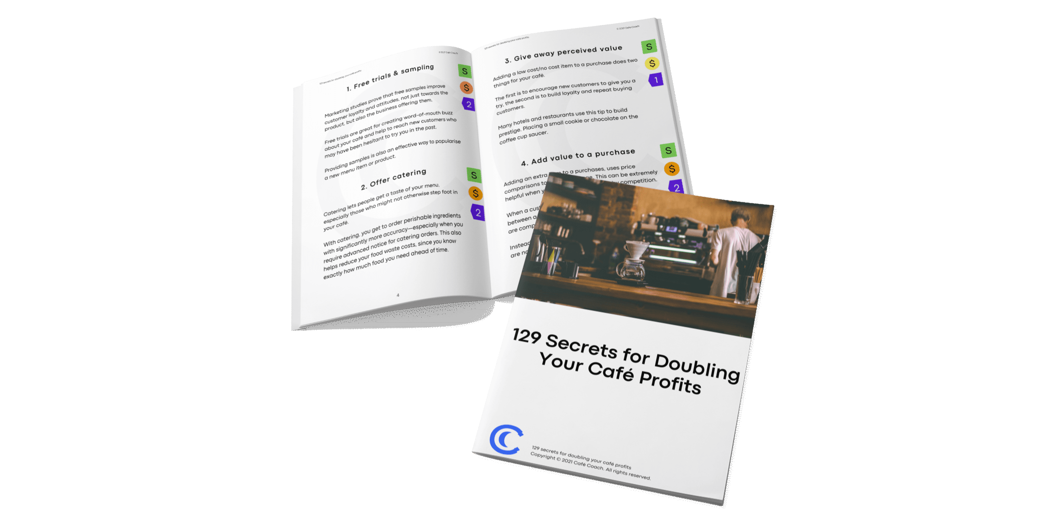 129 Secrets for Doubling Your Cafe Profits has been created for coffee shop and café owners who are in business for themselves for the first time. Also helpful for experienced entrepreneurs in the café industry who are looking for resources to give their cafe manager(s) and team.